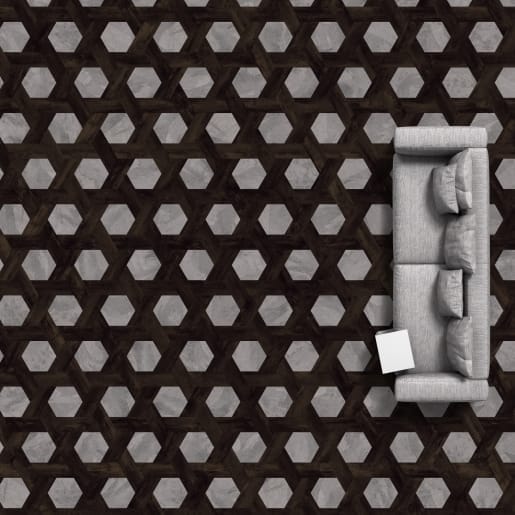 Een unieke en gedurfde vloer die geheel te stijlen is naar eigen smaak. Door de combinatie van een centrale zeshoek die omringd wordt door een verweven parallellogrammen, vormt dit duo een prachtig patroon, waardoor de ruimte een artistieke uitstraling krijgt.